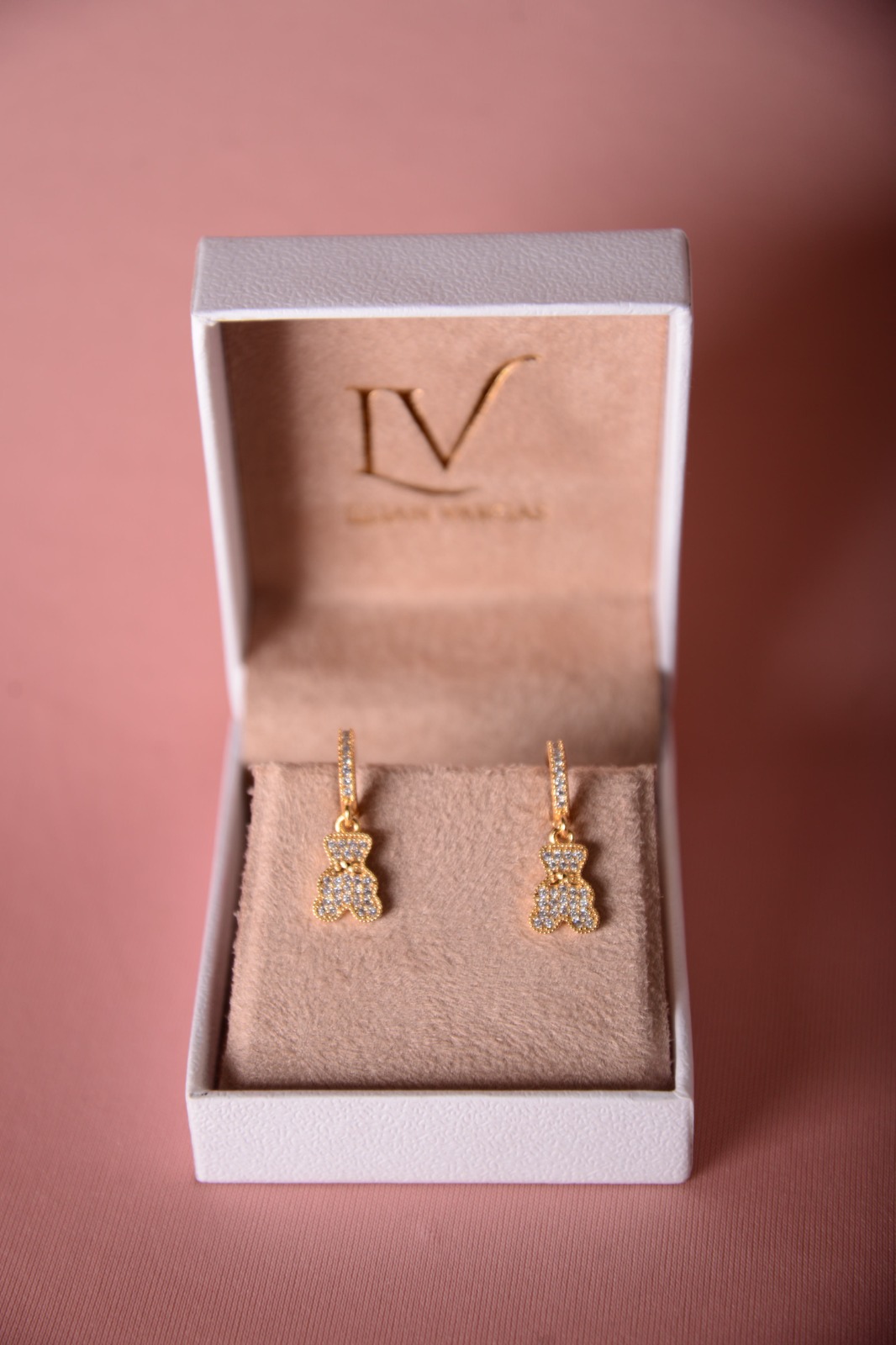 Brinco de argola com pingente de ursinho cravejado
