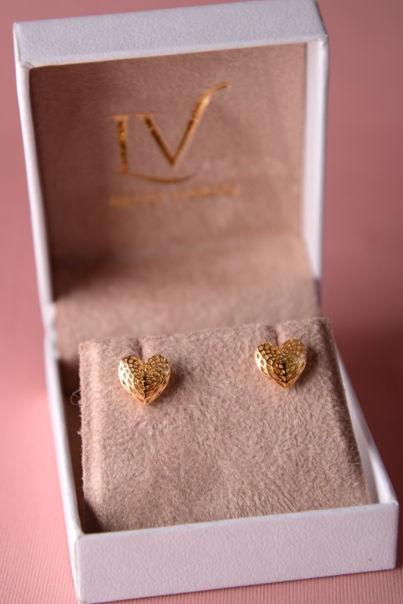 Este brinco pequeno em formato de coração traz um design rendado que confere leveza e sofisticação à peça. Banho em ouro 18k, perfeito para quem busca um toque romântico e moderno ao mesmo tempo.