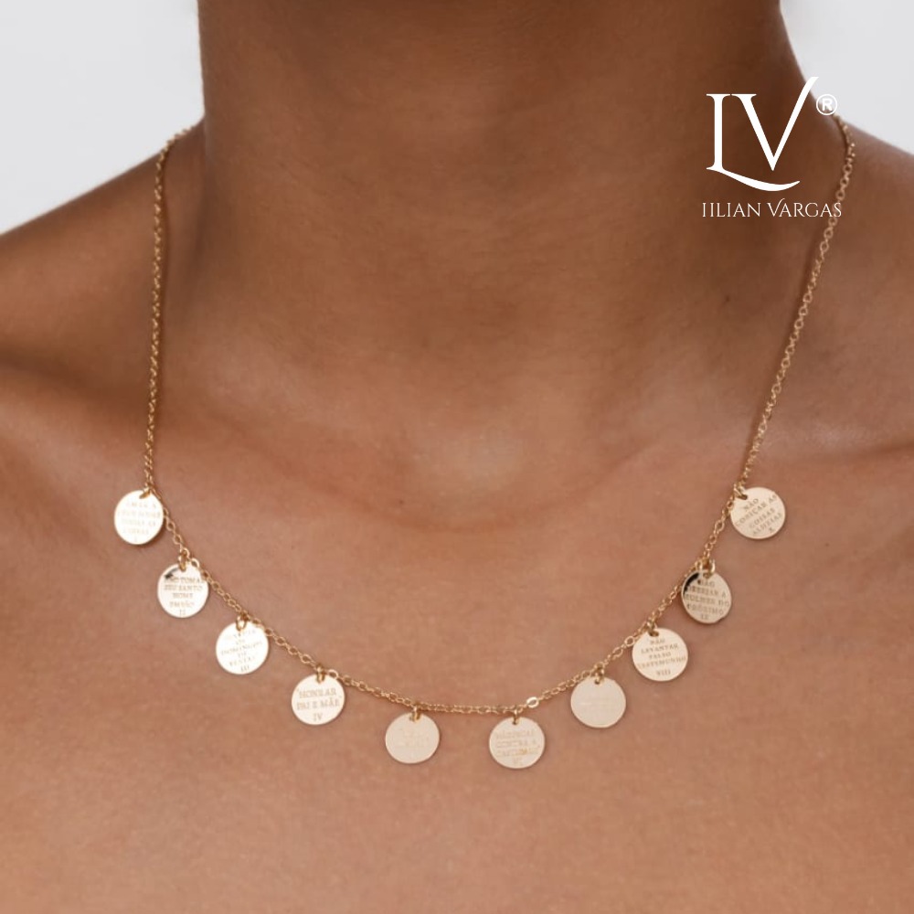 Colar Com a corrente em mini elo em metal banhado a ouro 18K, esta peça apresenta 10 medalhas em formato dos 10 mandamentos;
