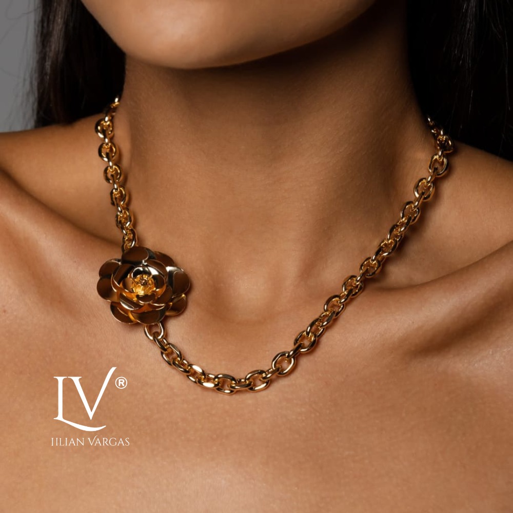 Colar corrente em elos 42 cm e pingente de camélia esculpida com lindas pétalas;
