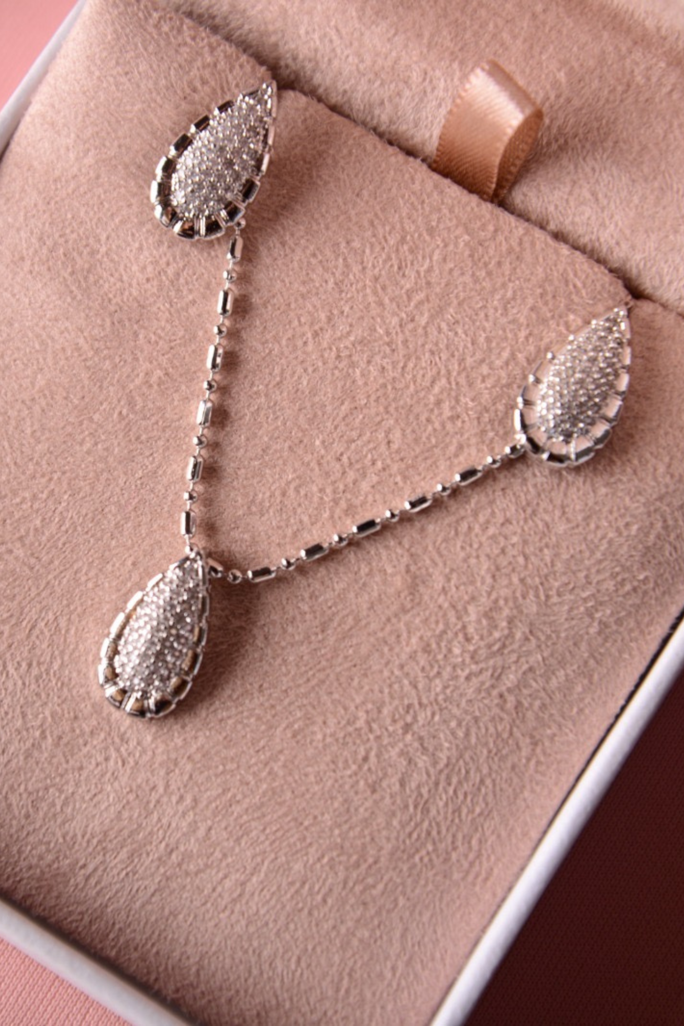 Esse conjunto encantador é composto por colar com pingente e brincos em formato de gota, todos cravejados com zircônias que refletem a luz com elegância. O banho de ródio garante brilho duradouro e acabamento refinado, ideal para compor looks românticos, sofisticados e atemporais.