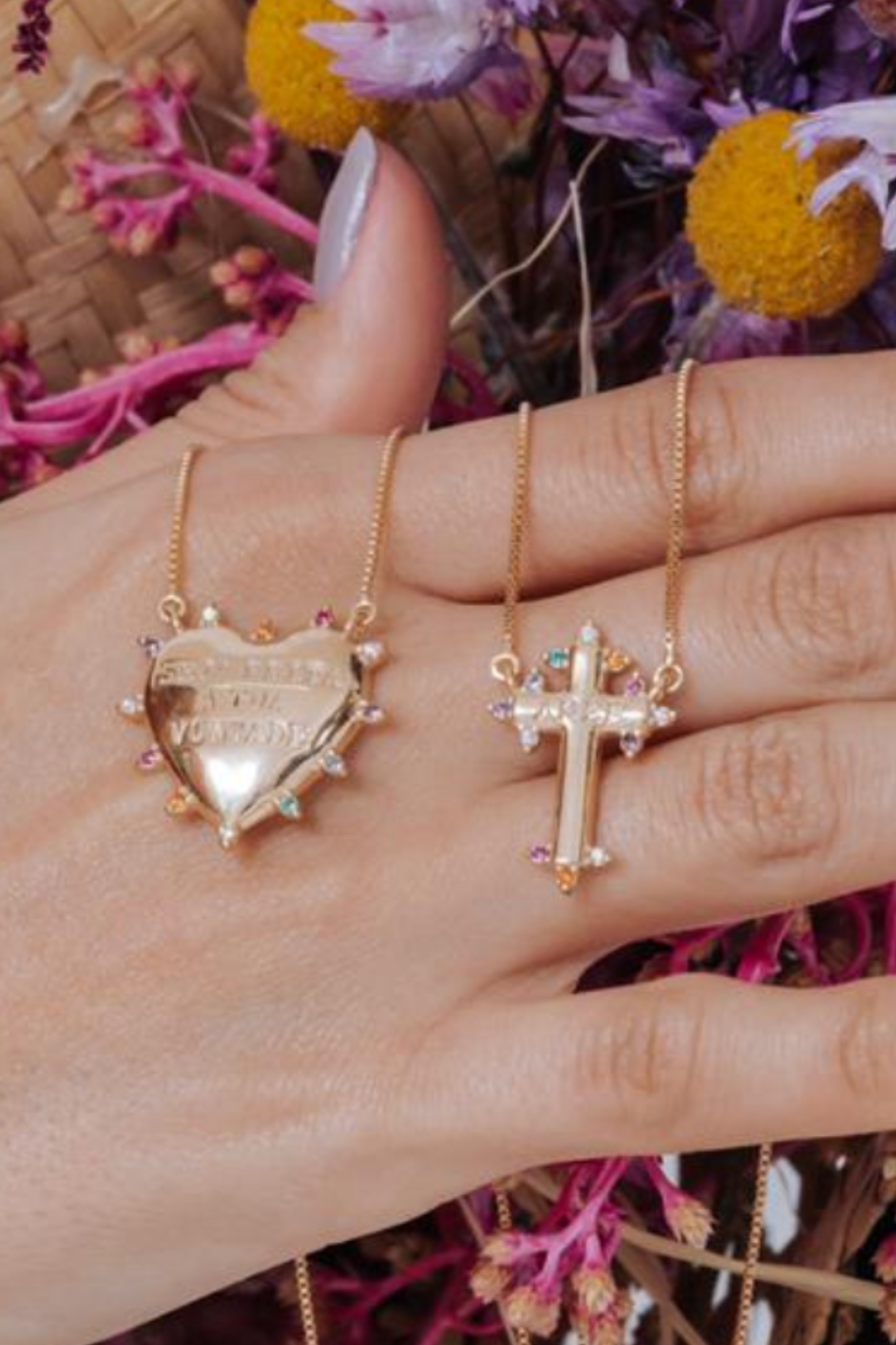 Escapulário lado coração "seja feita tua vontade" e lado cruz com zirconias coloridas