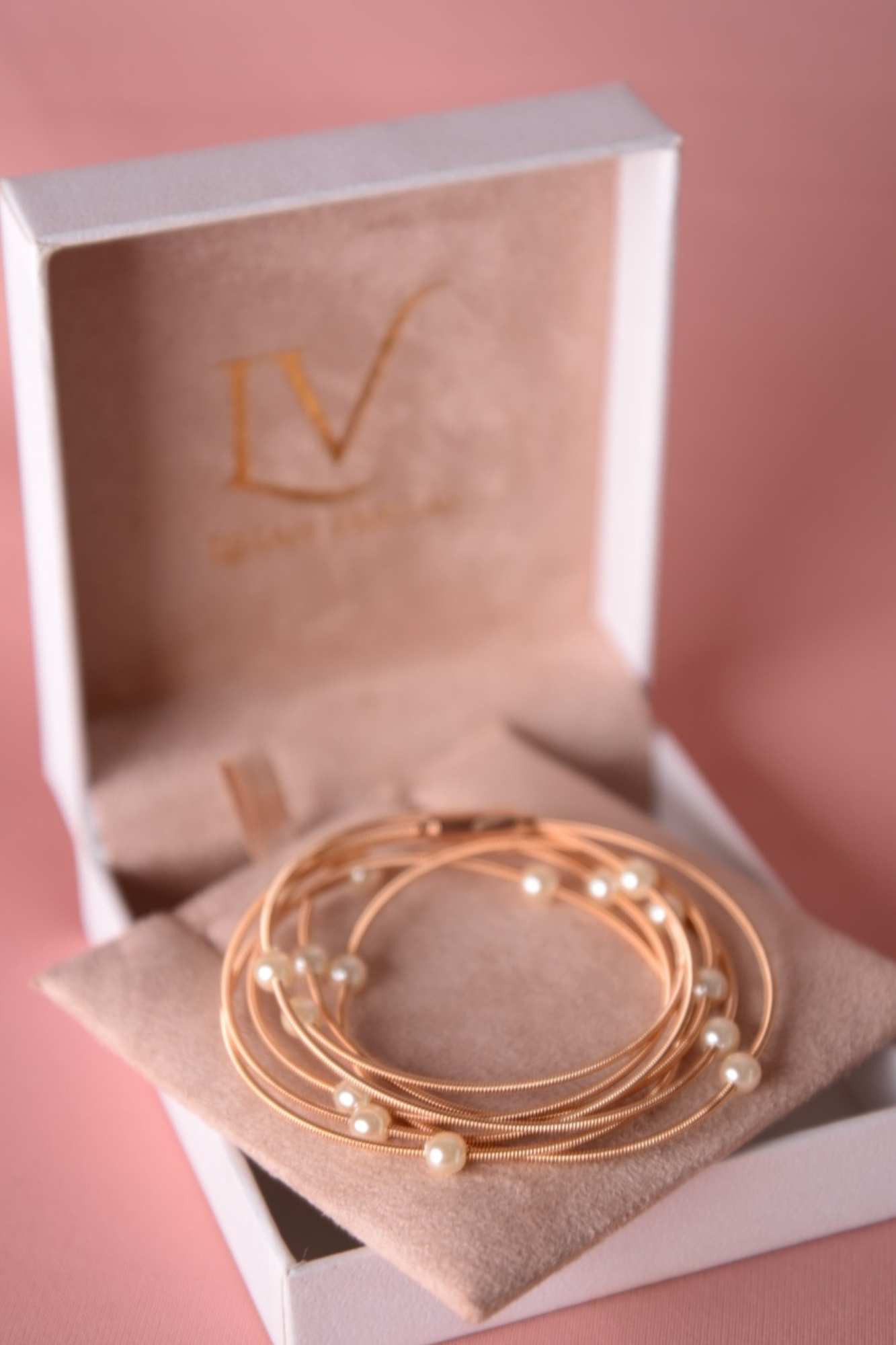 Pulseira várias voltas, banhada a ouro rosê com pérolas