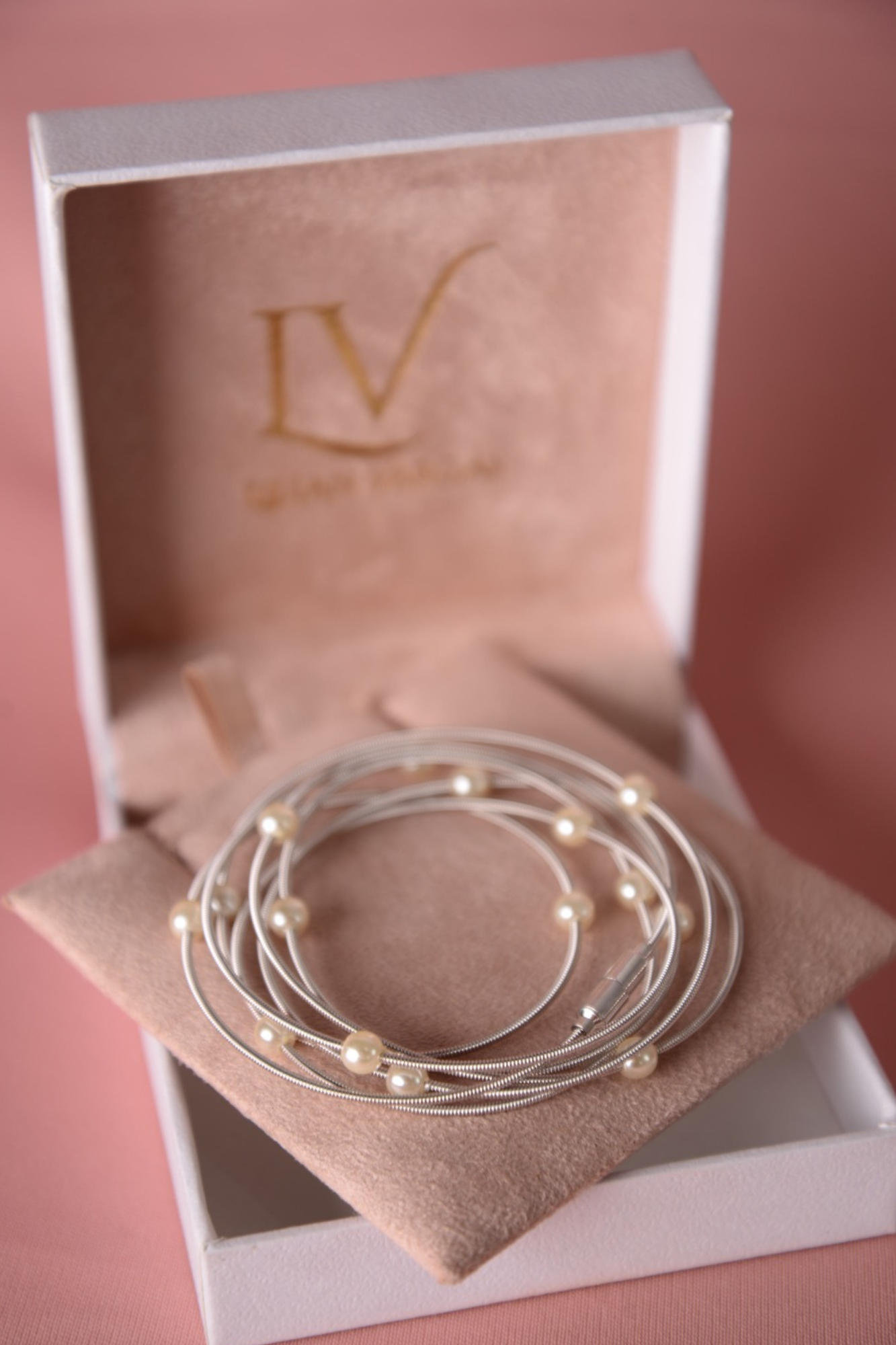 Pulseira várias voltas, banhada a ródio com pérolas